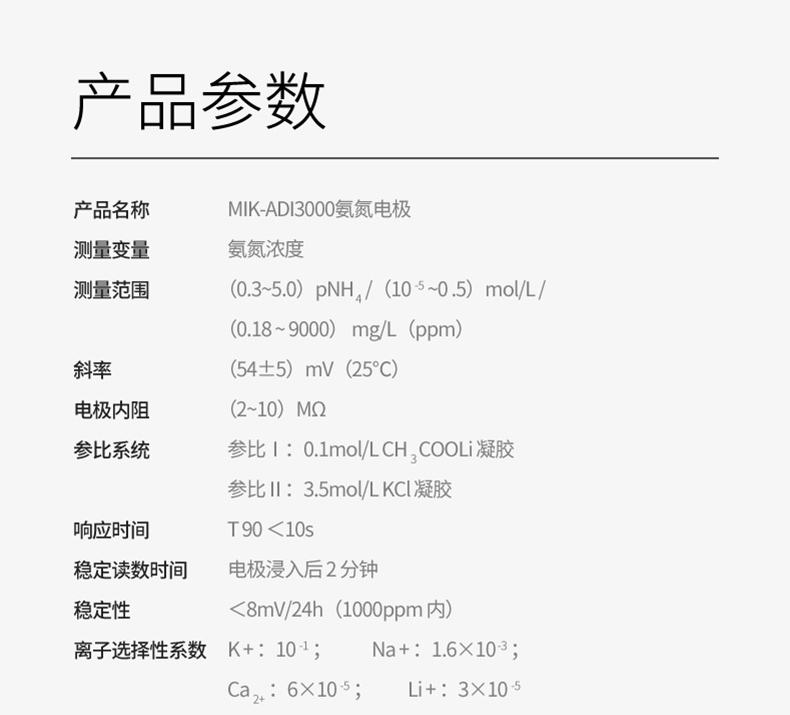 氨氮复合电极可直接测量溶液中的氨氮浓度,适用于葡萄酒、啤酒、饮料、肥料、饮用水、天然水、生活污水和工业废水的氨氮浓度测量。本电极输出 RS485 数字信号,RS485-MODBUS 通讯协议配套使用。